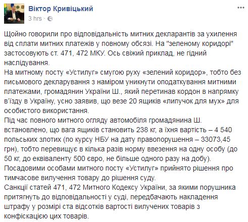 "На таможенном посту "Устилуг" полосой движения "зеленый коридор", то есть без письменного декларирования с намерением избежать обложения таможенными платежами, гражданин Украины Ш., который пересекал границу в направлении въезда в Украину, устно заявил, что везет 20 ящиков "липучек для мух" для личного использования", - написал Кривицкий.