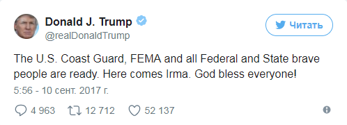 "Береговая охрана США, FEMA и все храбрые сотрудники на федеральных ведомств и на уровне штатов готовы. Ирма на подходе. Благослави вас всех Бог!", - написал Трамп.