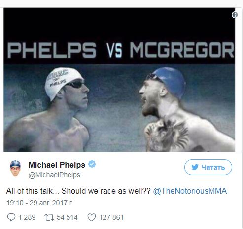Напомним, что 23-кратный олимпийский чемпион предложил чемпиону UFC в легком весе Конору Макгрегору провести заплыв.