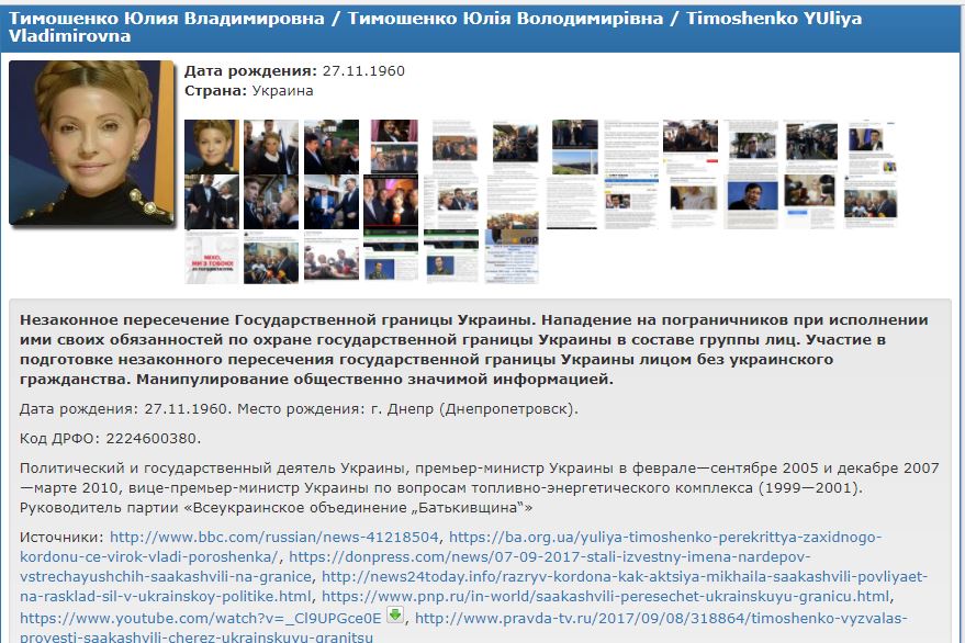 На страничке сайта, посвященной политику, сообщается, что Тимошенко, якобы, виновна в нападении на пограничников при исполнении ими служебных обязанностей во время "прорыва" в Украину Михаила Саакашвили.
