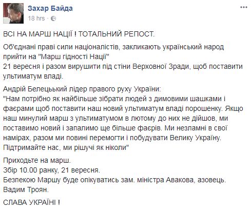"21 сентября вместе отправимся под стены Верховной Рады, чтобы поставить ультиматум власти", - написал он.