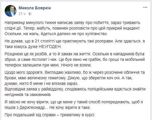 "Не думал, что в 21 веке еще практикуют такие расправы. Но кажется, я таки кому-то очень НЕУГОДЕН. Расцениваю это как разбой, а то и покушение на жизнь. Поскольку у нападавших было оружие, а именно пистолет и нож. Это был явно не грабеж, потому что деньги и мобильный телефон оставили при мне. Ничего не взяли", - пишет Бояркин.