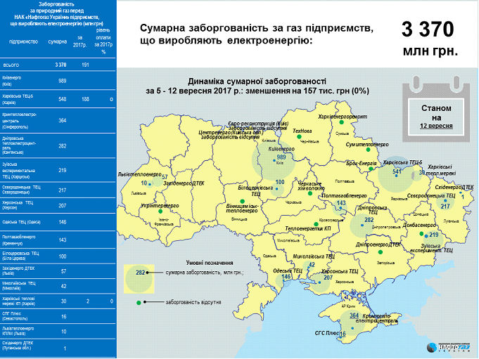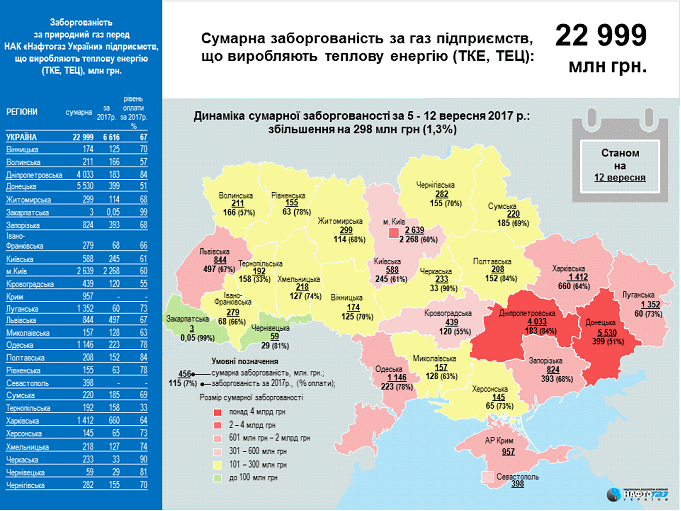 По состоянию на 12 сентября 2017 года суммарная просроченная задолженность предприятий ТКЭ, ТЭЦ и прямых промышленных потребителей перед НАК "Нафтогаз Украины" составляет около 29,2 млрд  млн грн.