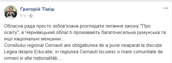 Тимиш в своем обращении отмечает, что Черновицкая областная рада представляет интересы всех жителей региона, в том числе и многочисленной румынской общины. По словам нардепа принятие антиконституционного закона вызвало серьезную озабоченность в среде румын Черновицкой области.