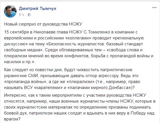 "15 сентября в Николаеве глава НСЖУ С.Томиленко в компании с европейскими и российскими "коллегами" проводит "региональную дискуссию" на тему "Безопасность журналистов: базовый стандарт свободных медиа". Среди обговариваемых тем – "свобода слова и плюрализм мнений во время конфликтов, борьба с пропагандой войны и насилия и пр.". - написал он, особо подчеркнув участие в мероприятии российских журналистов.