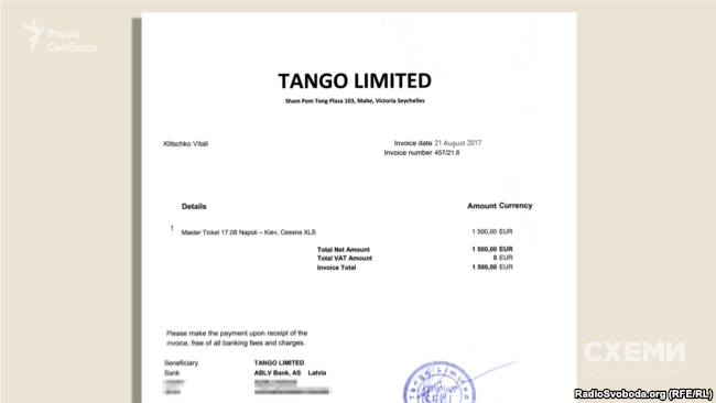 В счете за перелет, который Виталий Кличко отправил журналистам, указано, что мэр Киева должен оплатить 1500 евро без НДС на рухок компании "Tango limeted", зарегистрированной на Сейшельских островах.