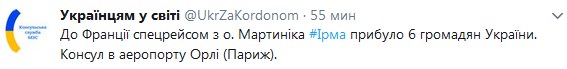 "Во Францию спецрейсом с о. Мартиника из-за урагана "Ирма" прибыло 6 граждан Украины", - говорится в сообщении.