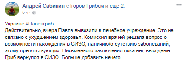 "Это не связано с ухудшением здоровья. Комиссия врачей решала вопрос о возможности нахождения в СИЗО, о наличии/отсутствии заболеваний, этому препятствующих. Письменного заключения пока нет, выходные", - написал он на странице в Facebook.