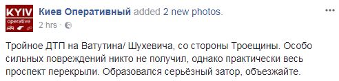 "Тройное ДТП на Ватутина/ Шухевича, со стороны Троещины. Особо сильных повреждений никто не получил, однако практически весь проспект перекрыли", - сообщили на портале.