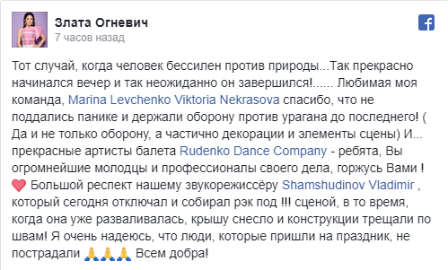 "Тот случай, когда человек бессилен против природы. Так здорово начинался вечер и так неожиданно он завершился!" - подписала певица короткий ролик про ураган.