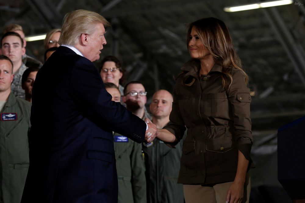 Мелания выступила с речью перед военнослужащими. Первая леди поблагодарила их за работу по ликвидации последствий двух ураганов. Затем папарацци запечатлели неловкий момент: после своего выступления Мелания объявила, что выступит ее муж Дональд Трамп, президент, в свою очередь, вместо того чтобы ее обнять и поцеловать, с непроницаемым выражением лица пожал ей руку и подтолкнул в спину, направив туда, где она должна сесть.