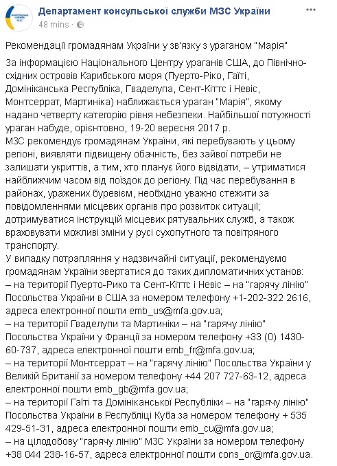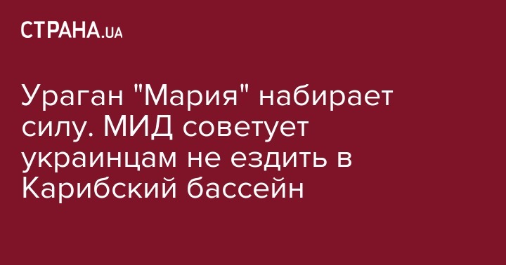 Министерство иностранных дел Украины рекомендует украинцам воздержаться от поездок в страны Карибского бассейна в связи с ураганом "Мария", а тем, кто находится в регионе, проявлять повышенную осторожность, без лишней надобности не покидать укрытий.