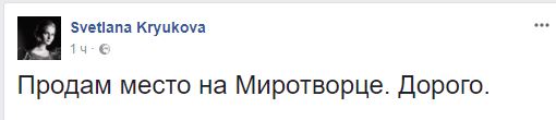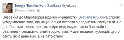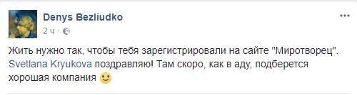 "Жить нужно так, чтобы тебя зарегистрировали на сайте "Миротворец". Svetlana Kryukova поздравляю! Там скоро, как в аду, подберется хорошая компания", - отреагировал на событие журналист Денис Безлюдько.