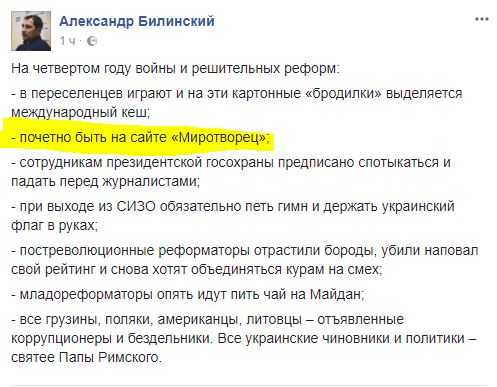 "На четвертом году войны и решительных реформ почетно быть на сайте "Миротворец", - заявил журналист Александр Билинский.