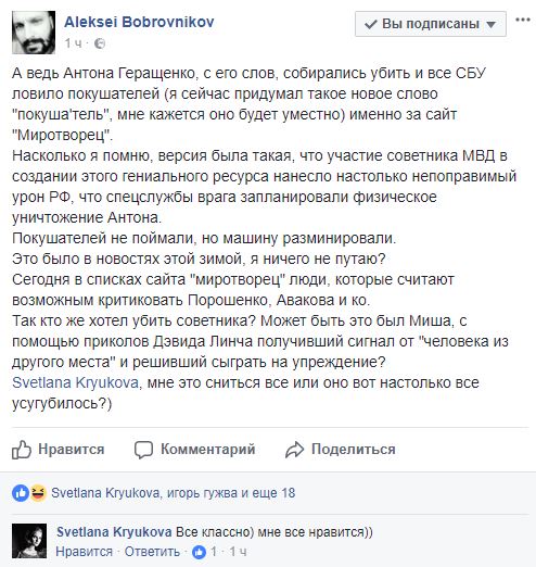 Бобровников пишет, что в покушении обвиняли спецслужбы России, которым Миротворец якобы нанес сильный урон.