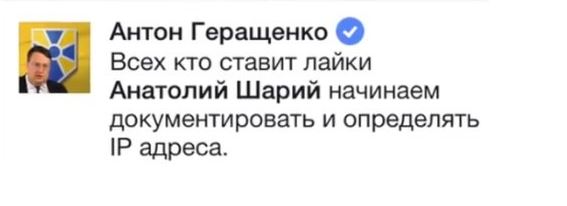 Напомним, куратор "Миротворца" Антон Геращенко в 2015 году похожим образом грозил вычислить IP тех, кто "лайкает" посты видеоблогера Анатолия Шария.