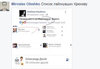 Тем временем один из авторов "Миротворца" Мирослав Олешко уже начал вести учет тех, кто отреагировал пост Светланы Крюковой о внесении ее на сайт.