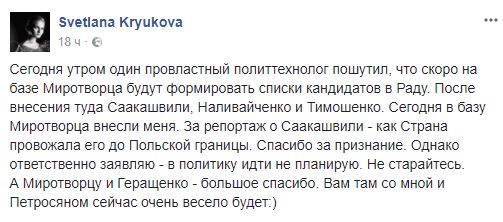 Сама Крюкова отнеслась к внесению на "Миротворец" с юмором.