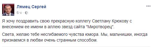 "Я хочу поздравить свою прекрасную коллегу Светлану Крюкову с внесением ее имени в аллею звезд сайта "Миротворец". Света, желаю тебе несгибаемого чувства юмора. Мы, мальчишки, иногда признаемся в любви очень странным способом", - написал журналист в Facebook.
