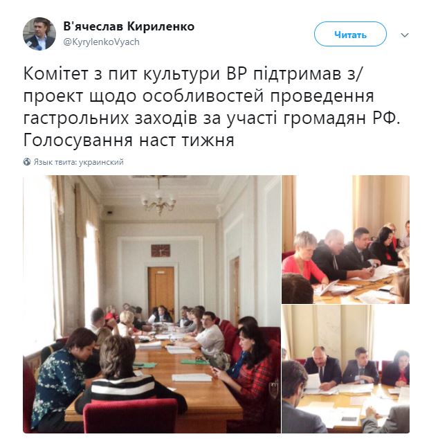 Комитет Верховной Рады по вопросам культуры поддержал законопроект, усложняющий проведение гастрольных мероприятий граждан России в Украине. Об этом сообщил вице-премьер-министр Вячеслав Кириленко в Twitter.