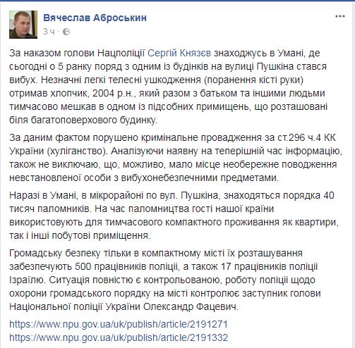 В полиции считают, что взрыв рядом с одним из домов на улице Пушкина в Умани мог произойти из-за неосторожного обращения неизвестного лица с взрывоопасными предметами. Об этом в Facebook написал первый заместитель главы Национальной полиции Вячеслав Аброськин.