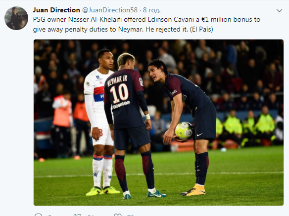 Президент ПСЖ Нассер Аль-Хелаифи предложил Кавани миллион евро, чтобы тот уступил Неймару свое право пробивать 11-метровые. Причем, бонус Кавани, вне зависимости от того, станет ли он лучшим бомбардиром чемпионата Франции, сохранялся.