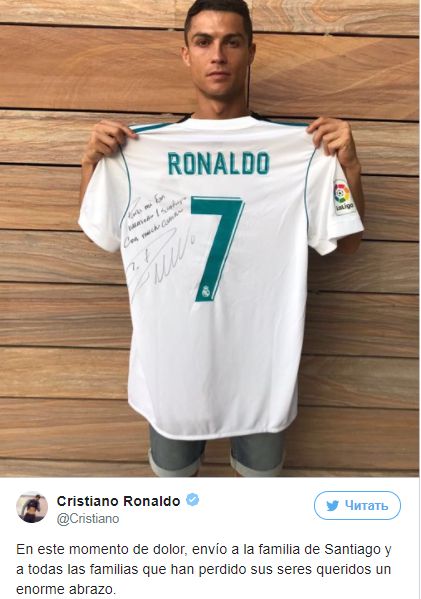 "В этот момент боли я обнимаю семью Сантьяго и семьи всех, кто потерял своих близких", - написал Криштиану Роналду в своем Twitter.