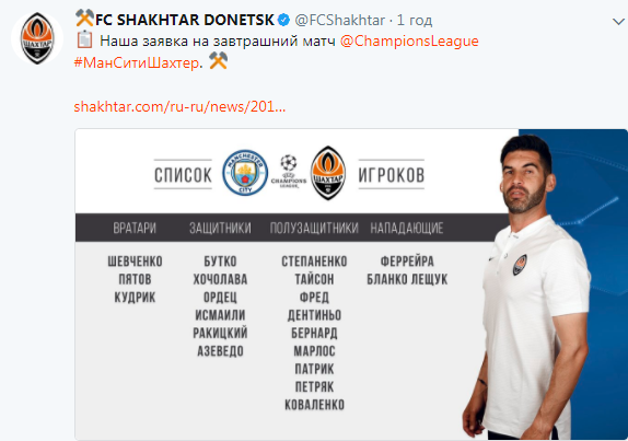 А тем временем тренер "Шахтера" обнародовал список футболистов, которых он включил в заявку на матч против "горожан".