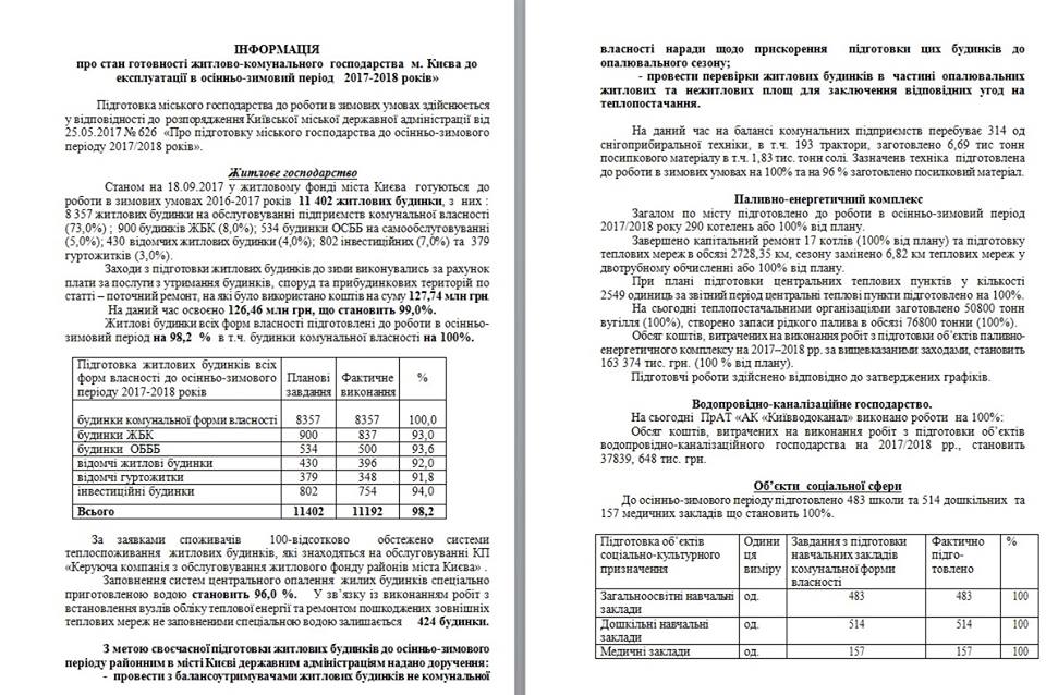 В сообщении Киевэнерго говорится, что к зиме готовы 80% домов. Депутат Киевсовета Александр Пабат опубликовал у себя в Facebook иную информацию о готовности объектов ЖКХ к зиме. Согласно этим данным, жилые дома готовы к зиме на 98%, в том числе дома коммунальной собственности на 100%. "По заявкам потребителей 100-процентно обследованы системы теплопотребления жилых домов", - говорится в документе.