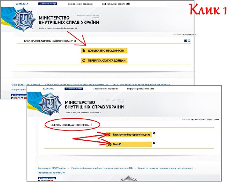 Вы заходите на сайт mvs.gov.ua или hsc.gov.ua, выбираете способ зарегистрироваться, воспользовавшись электронной цифровой подписью или IDBank. (Клик 1).