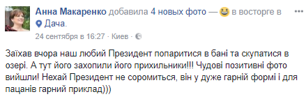 "Заехал вчера наш дорогой президент попариться в бане и искупаться в озере. А здесь его захватили его сторонники. Замечательные позитивные фото получились. Пусть президент не стесняется, он в хорошей форме и для пацанов хороший пример", - написала Анна Макаренко.