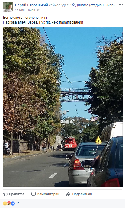 15:25 "Все ждут - прыгнет или нет. Парковая аллея. Сейчас. Движение под ней парализовано", - написал в Facebook пользователь Сергей Старенький.