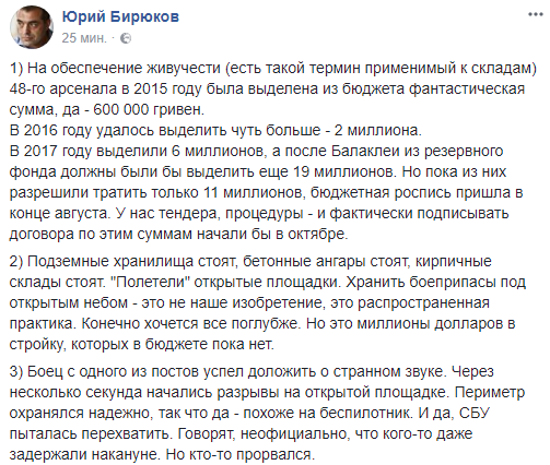 Он высказал мнение, что это Муженко допускает халатность, из-за которой в очередной раз взрывается склад: "это последняя точка и больше игнорировать ситуацию мы не можем себе позволить".