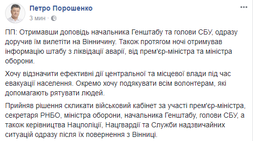 23.48 - Порошенко собрал военный кабинет и поручил наказать любых виновных во взрывах под Винницей