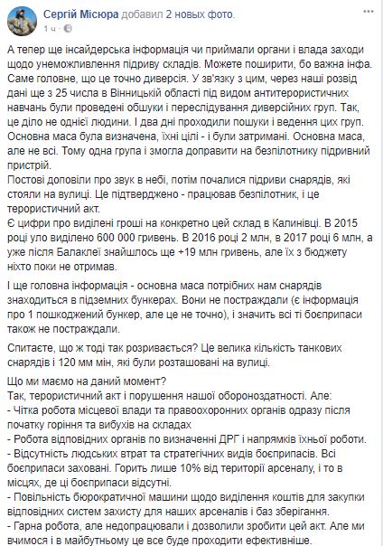 "Это точно диверсия. В связи с этим, и нашими разведданными еще с 25 числа в Винницкой области под видом антитеррористических учений были проведены обыски и преследования диверсионных групп. Да, это дело не одного человека. И два дня проходили поиски и ведение этих групп. Основная масса их цели были определены – и были задержаны. Основная масса, но не все. Поэтому одна группа смогла доставить на беспилотнике взрывное устройство", – написал Мисюра.
