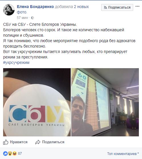 На слете украинских блогеров (сокращенно - СБУ) в Киеве, который собрал около 140 человек, также присутствует примерно столько же полицейских и сотрудников СБУ. Об этом на своей странице в в Facebook экс-нардеп Елена Бондаренко, принявшая участие в мероприятии.