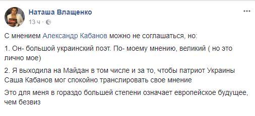 Заявление Кабанова вызвало ажиотаж в медиа-сфере - многие комментаторы патриотического толка устроили нападки на поэта. В ответ им телеведущая Наталья Влащенко заявила, что "выходила на Майдан в том числе и за то, чтобы патриот Украины Саша Кабанов мог спокойно транслировать свое мнение".