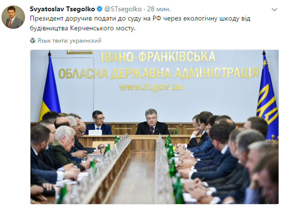 "Президент поручил подать в суд на РФ из-за экологического вреда от строительства Керченского моста", - написал Цеголко в twitter по итогам совещания в Ивано-Франковской облгосадминистрации в пятницу.