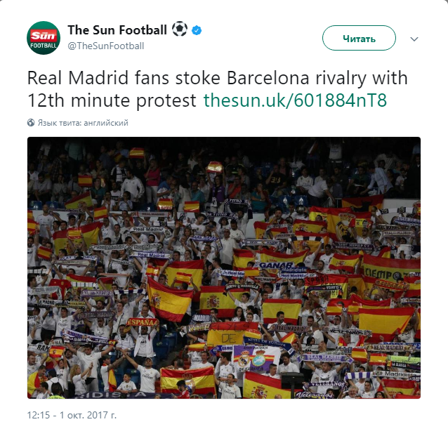 Болельщики "Реала" вчера, 1 октября, в день референдума о независимости в Каталонии устроили свою акцию патриотизма. Об этом сообщает Mundo Deportivo.