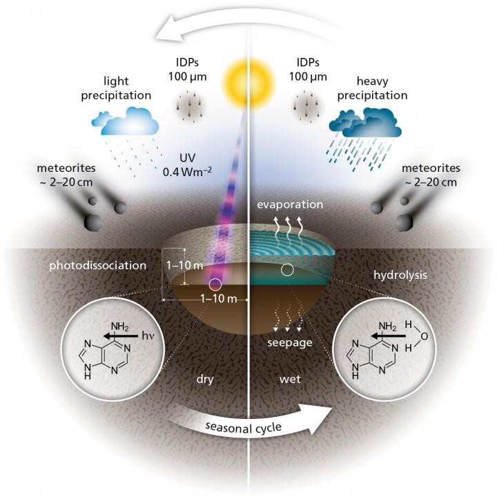 Авторы новой работы использовали данные физической химии и астрофизики и на их основе построили модель того, как в теплых мелких водоемах могли образовываться нуклеотиды, а из нуклеотидов - РНК. По их расчетам, космическая пыль не могла быть источником азотистых оснований, так как не содержала их в нужных количествах. Зато этой цели могли послужить метеориты, которые крайне часто падали на планету в период поздней тяжелой бомбардировки. По всей видимости, они попадали во многие водоёмы, привнося туда компоненты для синтеза нуклеотидов.