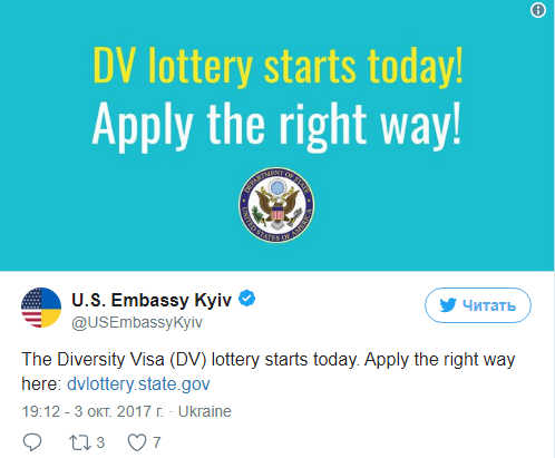 С 3 октября по 7 ноября в Украине можно будет подать заявку для участия в американской визовой лотерее Green Card, которая дает права на работу и проживание в США на 2019 год. Об этом в Twitter сообщает посольство США в Украине.