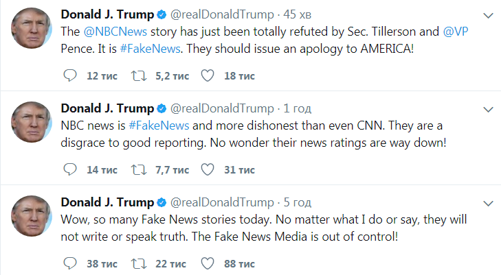 "История "Эн-Би-Си Ньюс" была полностью опровергнута госсекретарем Тиллерсоном и вице-президентом Пенсом. Это фейковые новости. Они должны извиниться перед Америкой!" - написал Трамп.