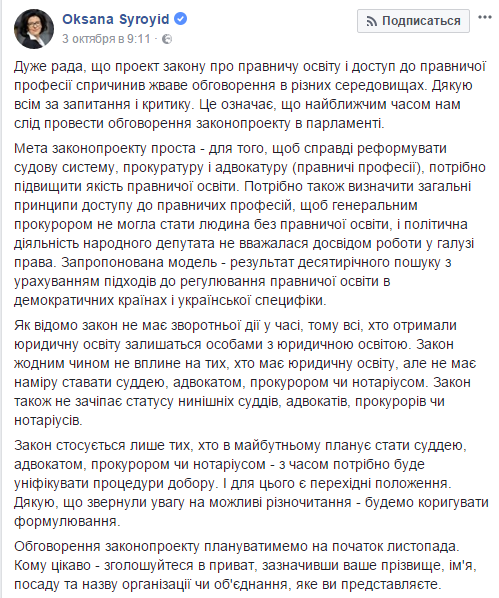 Напомним, проект закона о юридическом образовании и общем доступе к правоведческой профессии зарегистрирован в парламенте группой народных депутатов во главе с Оксаной Сыроид. Он предусматривает процедуру подтверждения юристами своих дипломов каждые 5 лет, что привело уже к возмущению юридического сообщества.