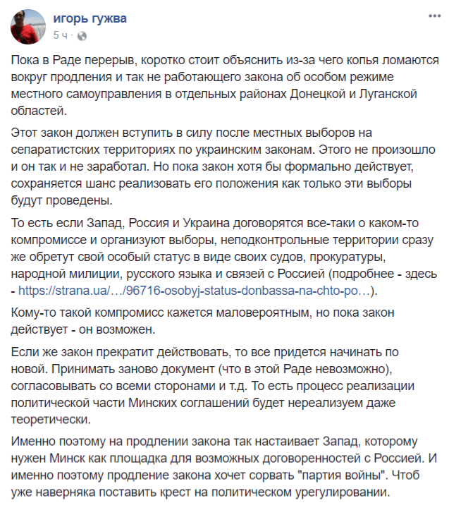 Но сама возможность реализации данных положений остается пока действует закон. Ведь вдруг все-таки о местных выборах договорятся и тогда закон вступит в силу со всеми "пряниками" для сепаратистов.