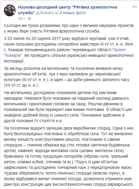 В Черновицкой области во время раскопок нашли ряд археологических объектов, среди которых могильник IV века с погребением младенца. Об этом сообщается в Facebook Научно-исследовательского центра "Спасательная археологическая служба".