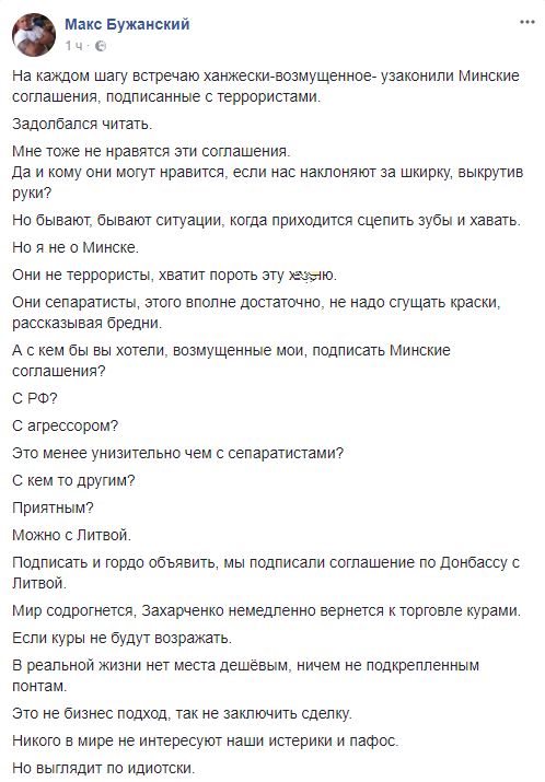 Макс Бужанский, блогер: "На каждом шагу встречаю ханжески-возмущенное- узаконили Минские соглашения, подписанные с террористами. Задолбался читать. Мне тоже не нравятся эти соглашения. Да и кому они могут нравится, если нас наклоняют за шкирку, выкрутив руки?