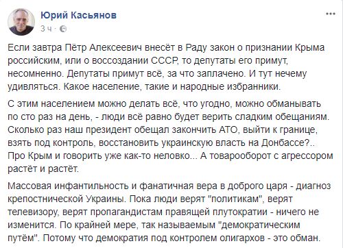 Юрий Касьянов, волонтер: "Если завтра Пётр Алексеевич внесёт в Раду закон о признании Крыма российским, или о воссоздании СССР, то депутаты его примут, несомненно. Депутаты примут всё, за что заплачено. И тут нечему удивляться. Какое население, такие и народные избранники.
