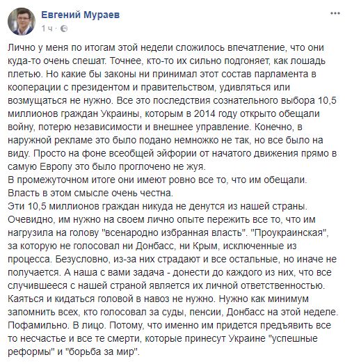 Евгений Мураев, депутат: "Лично у меня по итогам этой недели сложилось впечатление, что они куда-то очень спешат. Точнее, кто-то их сильно подгоняет, как лошадь плетью. Но какие бы законы ни принимал этот состав парламента в кооперации с президентом и правительством, удивляться или возмущаться не нужно. Все это последствия сознательного выбора 10,5 миллионов граждан Украины, которым в 2014 году открыто обещали войну, потерю независимости и внешнее управление. Конечно, в наружной рекламе это было подано немножко не так, но все было на виду. Просто на фоне всеобщей эйфории от начатого движения прямо в самую Европу это было проглочено не жуя. В промежуточном итоге они имеют ровно все то, что им обещали. Власть в этом смысле очень честна.