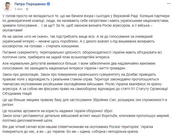 Петр Порошенко также высказался у себя на странице: "В голове просто не укладывается то, что мы видели вчера и сегодня в Верховной Раде. Бывшие партнеры по демократической коалиции, люди, которые называют себя патриотами и даже украинскими националистами, срывали голосования ... И за что? За то, чтобы законом признать Россию агрессором, а ее войска - оккупантами!