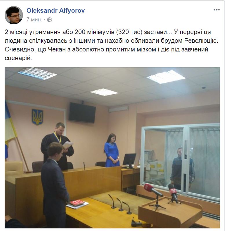 "В перерыве этот человек общалась с другими и нагло обливали грязью Революцию. Очевидно, что Чекан с совершенно промытым мозги и действует под заученный сценарий", - добавил Алферов.